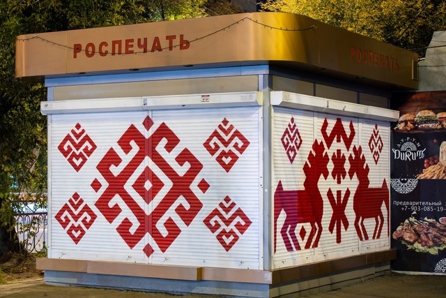На фасадах киосков «Роспечати» художница поместила паттерны уральских народностей: татар, башкир, удмуртов, коми-зырян и марийцев. Анастасия тщательно подбирала цвета, формы и смыслы, чтобы достоверно перенести на поверхность орнамент каждой культуры. Помогли все точно изобразить представители общин, которые не только консультировали, но и рисовали. Сама художница говорит, что «Городская энциклопедия узоров» — это большая коллективная работа.