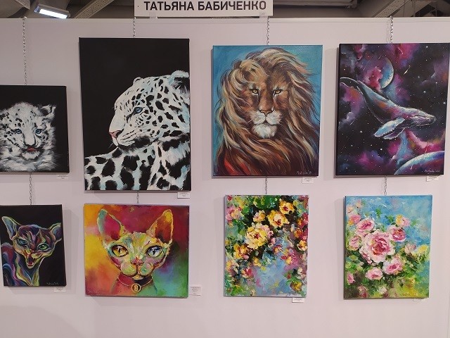 В этот раз на стендах среди портретов, натюрмортов и пейзажей можно было заметить большое количество холстов с изображением леопардов, львов и тигров, что соответствовало тематике вечеринке.