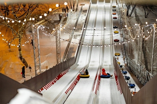 Покрытие горки выполнено из искусственного материала, а тюбинги подаются наверх с помощью подъемника: не нужно носить их вверх по лестнице самостоятельно.