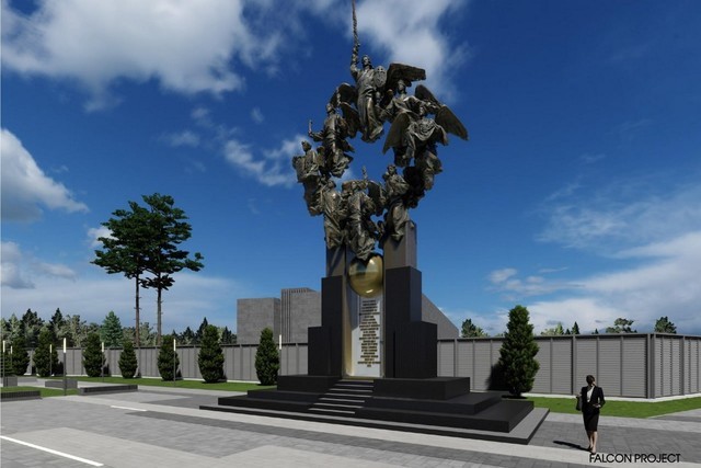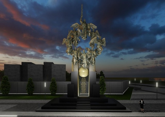 В новом проекте архитектор решил показать весь сонм небесных сил и создать эффект полёта. Ангелы будут парить над золотым шаром, символизирующим мироздание. Вся конструкция будет держаться на скрытых креплениях. Диаметр шара составит 1 800 мм. Все элементы скульптуры объединит лёгкая конструкция из бронированного стекла, на котором бронзовыми буквами будет написана молитва.