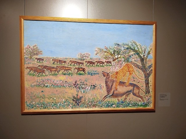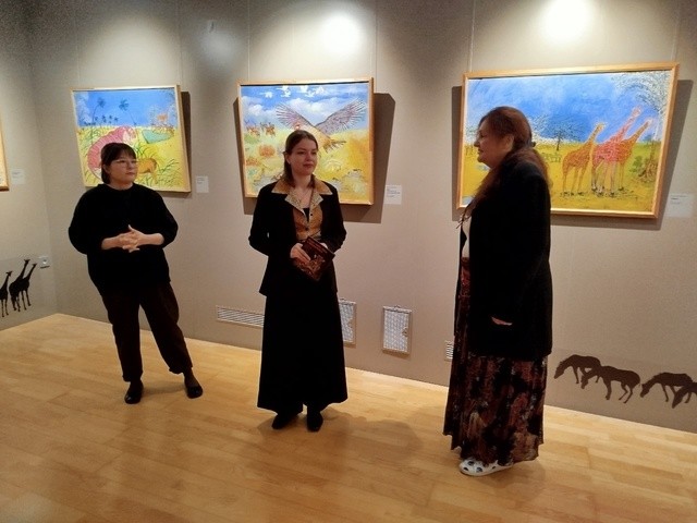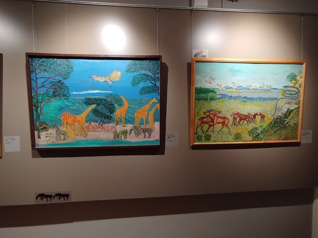 Выставку открывает серия работ Исмагила Мухаметжанова, центральной темой которых стал животный мир Африки. Художник никогда не был на этом континенте, но, увидев по телевизору фильм про Африку, он вдохновился ей и придумал свой собственный материк, наполненный пестрыми красками и различными животными. На его полотнах оживают эпизоды суровых схваток хищников и травоядных. При этом некоторые животные предстают в иной окраске. К примеру, зритель видит зелёных зебр или розового тигра.