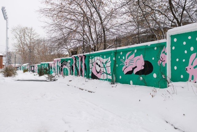 Второй забор находится на Эльмаше, возле школы-интерната № 11. Его протяженность составляет 128 метров. Произведение уличного искусства придумала и воплотила в жизнь художница Наташа Пастухова совместно с учениками школы и горожанами в рамках инклюзивной мастерской. В каждой секции мурала можно найти знаковые локации микрорайона и впечатления ребят о жизни на Эльмаше.