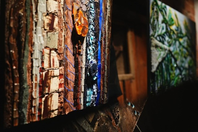 Диптих «Предчувствие» – результат более общих размышлений Анастасии Лесяк, пресловутый «пейзаж после нас». Серия работ, созданных в смешанной технике мозаики и керамики раскрывает исполинскую силу и мощь уральских гор и заключенных в них сокровищ.
