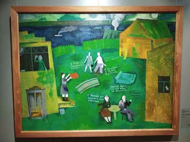 Открывает экспозицию масштабное полотно «Село Чусовое» – это коллективная работа 12 художников, которые в разное время были причастны к этому селу. У них были творческие мастерские и дачи. Картина представляет собой калейдоскоп деревенского мира, с бытовыми сюжетами, сценами отдыха, работы. На холсте также можно заметить самих художников, которые черпают вдохновение в деревенской жизни.
