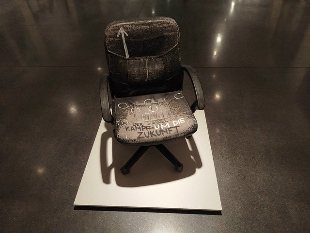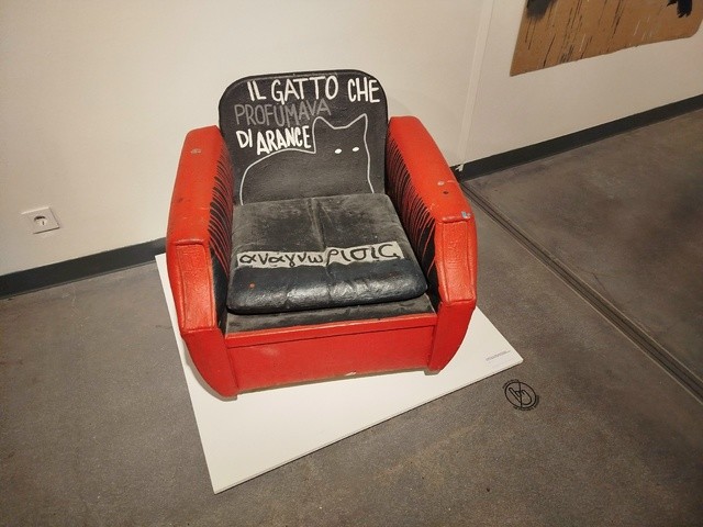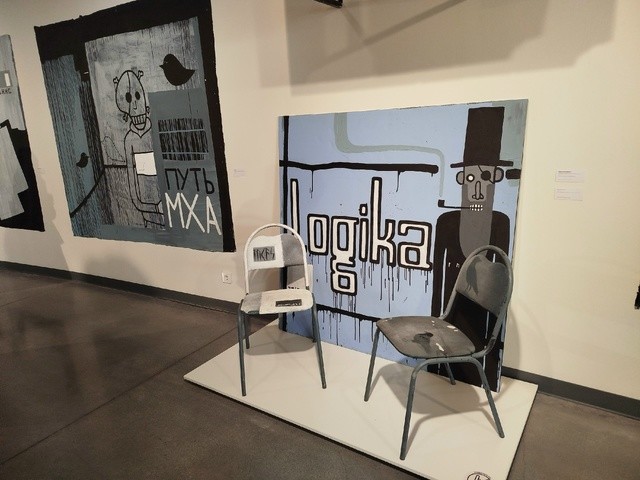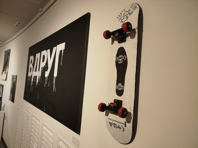 Помимо холстов Валерий Чтак выбирал для работы необычные поверхности гофрокартон, офисные стулья, столешницы, табуреты, кресла, чемоданы, скейтборды и одежду.