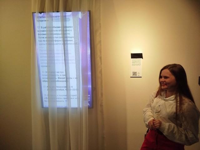 «Ежедневно мы перегружены чатами, мессенджерами, социальными сетями, что создает огромное количество визуального шума. В моей работе экран занавешен шторкой, которая символизирует тонкую границу шума и тишины. Под экраном я разместила камни, которые делаю из переработанного полиэтиленового мусора - он тоже для меня является символом шума. Камни – это тишина, покой, поэтому у зрителя есть выбор: отодвинуть шторку и впустить очередную порцию шума в свое сознание или оставить ее нетронутой и насладиться безмолвием сада камней», – прокомментировала свою работу художник Мария Борисенкова.
