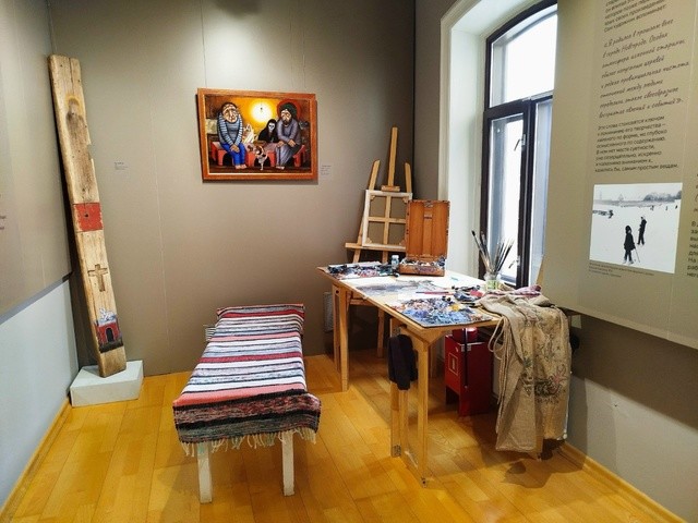 В одном из залов воссоздана мастерская художника. Посетители увидят стол, усеянный красками, кистями и эскизами художника, лавку, покрытую ковриком, мольберт и начатую работу на старой доске. Для создания особой атмосферы в помещении звучит пение птиц, под которое автор создает свои шедевры.
