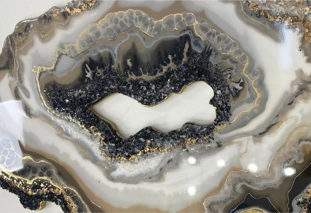 Жеода — представляет собой округлый камень с полостью, внутри которой разрастаются кристаллы. С помощью смолы, пигментов, специальных красителей и наполнителей вы создадите собственную жеоду, имитирующую срез мрамора. Вплетаясь в интерьер, она станет ярким акцентом и создаст уют в вашем доме. На выбор можно создать декоративную форму или поднос с ручками.