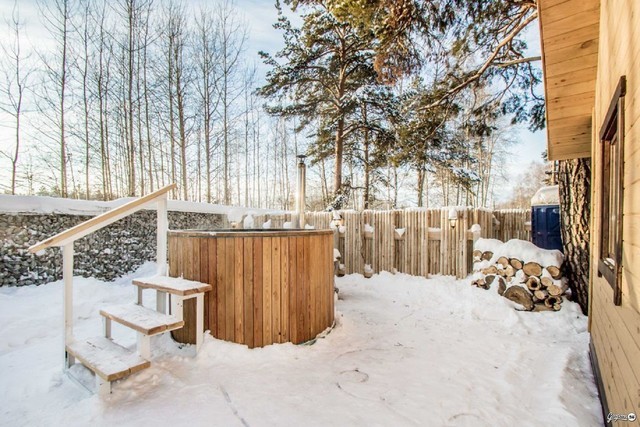 Стоимость аренды: коттедж - от 10 000 рублей/сутки; баня - от 1500 рублей/час; чан на дровах - 6000 рублей на всё время аренды бани.
