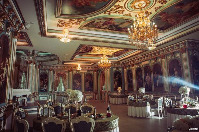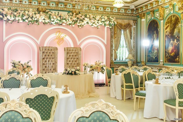 Банкет-холл «Эрмитаж» позволит провести свадебное торжество в атмосфере роскоши и благородства. Вы и ваши гости почувствуете себя словно на царском балу в шикарном дворце. Просторный светлый зал выполнен в классическом стиле: величественные колонны, золотая отделка, репродукция картин на стенах и потолках, большие окна с дорогими занавесками, элегантная мебель, люстры в виде канделябр. Кроме того, в помещении установлена сцена для выступлений артистов, музыкантов и танцевальных коллективов. Персонал сделает оригинальную сервировку стола и приготовит потрясающие блюда европейской кухни в красивой подаче. Есть отдельная welcome-зона для сбора гостей, приветственного фуршета и фотозоны. В большом закрытом дворе можно устроить огненные шоу и фейерверк.